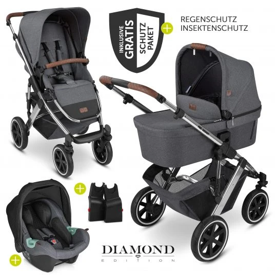 Der Kombi-Kinderwagen Salsa 4 Air – Diamond Special Edition – Asphalt von ABC Design ist ein perfekt ausgestatteter Allrounder auf 4 Rädern. Mit komfortabler Babywanne und umsetzbarer Sitzeinheit begleitet er Dein Kleines von der Geburt bis ins Vorschulalter. Die Diamond Edition vereint Intelligente Funktionen mit einzigartigem Stil und purer Eleganz. Ob das edel glänzende Chromgestell, der exklusive Melange-Stoff, kleine Details wie die Diamant-Naht an Schieber und Sitz oder die optisch eindrucksvollen Weißwand-Luftreifen – die Diamond Serie bietet zahlreiche Highlights.