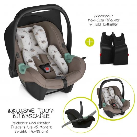 - 13-TEILIGES STARTER-SET: im Kinderwagen-Set mit Babywanne & Sportsitz + i-Size Autositz Tulip mit Adapter, Fußsack für die Tulip, Wickeltasche Urban, Regenverdeck, Moskitonetz, drei Spucktücher, zwei Magnet Clips & Kuscheldecke