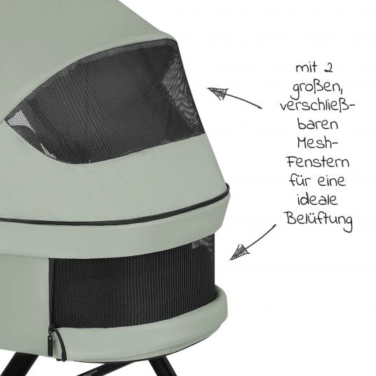 Die Babywanne ist mit einer hochwertigen, besonders weichen, ergonomischen Overnight-Matratze mit erhöhtem Rand im Kopfbereich ausgestattet und bettet Dein Neugeborenes sehr bequem. Geschützt wird es von der passenden Wannenabdeckung und einem großen Verdeck. Das Verdeck ist mit einem UV-Schutz 50+ ausgestattet. Für warme Tage ist jeweils ein Belüftungsfenster am Verdeck und eines am Kopfende der Wanne integriert.