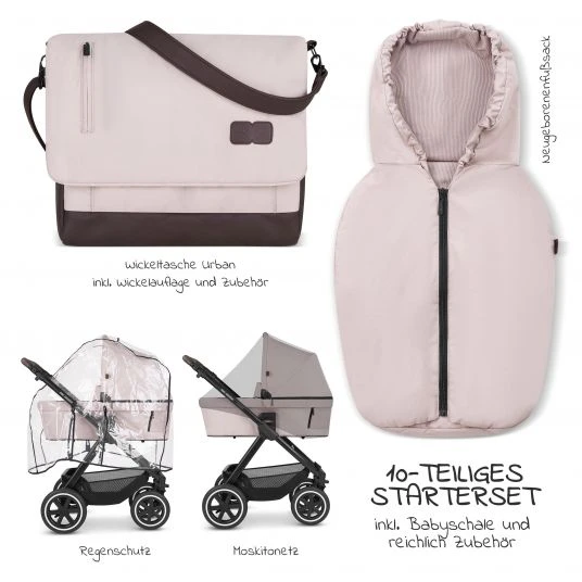 Zusätzlich zum Samba bekommst Du in diesem Starter Set die folgenden Zubehörteile: die Babyschale Tulip, den passenden Adapter für die Babyschale, einen Fußsack für die Tulip, die Wickeltasche Urban, zwei Magnet-Clips, ein Regenverdeck und ein Moskitonetz.