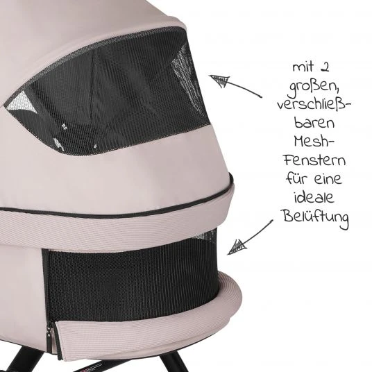 Für Sicherheit sorgen dabei ein gepolsterter 5-Punkt-Gurt und ein Schutzbügel. Praktisch: Für einen leichten Einstieg kannst Du den Bügel einfach aufklappen oder ganz abnehmen. Das große Verdeck schützt vor Wind und Wetter. Durch den UV-Schutz 50+ schützt es zuverlässig die empfindliche Haut Deines Kindes. Dank des Sicht- und Belüftungsfensters aus Mesh-Gewebe behältst Du Dein Kind jederzeit im Blick.