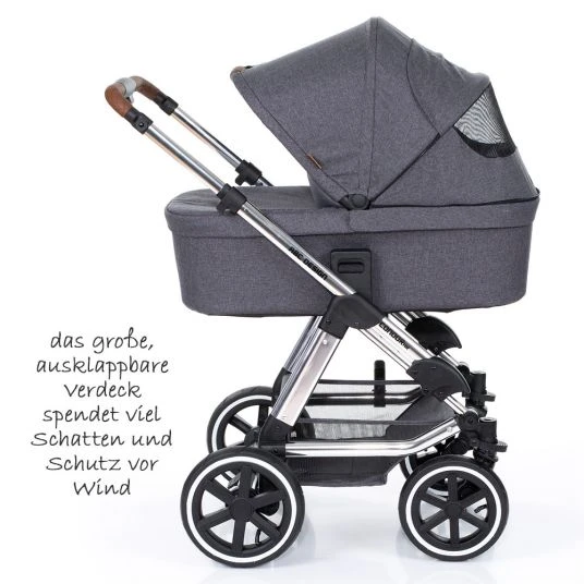 - Ausstattung: faltbare Babywanne mit Verdeck, Schutzdecke, Matratze und besonders weichem Innenleben, umsetzbarer Sportwagensitz mit verstellbarer, Babyschale Hazel und Adapter, gummierter Fußstütze, gepolstertem Gurtsystem und ausklappbarem Verdeck mit Sichtfenster, kugelgelagerte Lufträder, höhenverstellbarer Schieber mit Klick-System für Zubehör, Federung