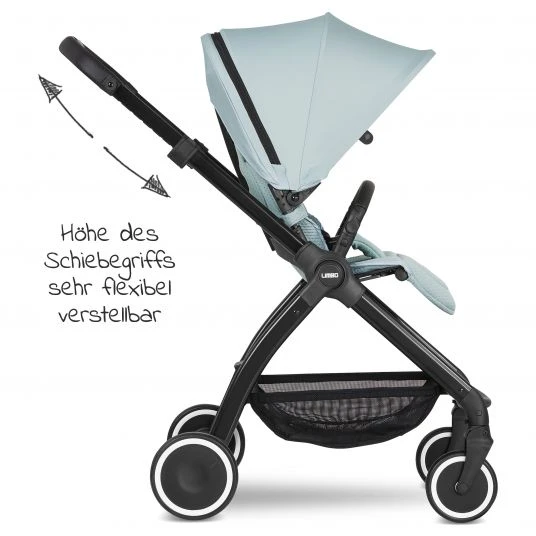 Der Limbo ist ausgesprochen schmal, leicht und handlich. Mühelos lenkst Du den wendigen Kinderwagen mit seinen Schwenkrädern durch Altstadtstraßen, Supermärkte oder folgt deinem schnellen Nachwuchs auf seinen noch wackligen Beinen. Ist es Zeit zum Ausruhen, findet Dein Schatz Platz in der komfortabel gepolsterten Sitzeinheit mit Fußstütze und großem integrierten Sonnenverdeck. Der Sitz lässt sich mit wenigen Handgriffen umsetzen oder in eine komplett waagerechte Liegeposition verstellen. Das Gestell lässt sich für den Transport einfach, schnell und sicher auf ein äußerst kompaktes Faltmaß klappen und mit der praktischen Trolley-Funktion auch bequem ziehen. Das macht ihn auch für aktive und reisefreudige Familien zum idealen Begleiter.