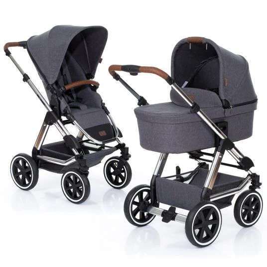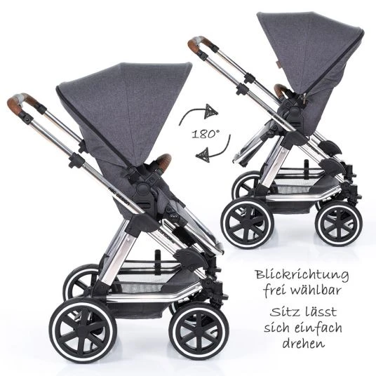 Im Kombi-Kinderwagen Condor 4 Air – Diamond Special Edition von ABC Design kurvst Du leichtgängig durch die Straßen und Gelände, während dein Baby in der gemütlichen Babywanne mit Verdeck und Schutzdecke schläft. Der Condor 4 Air verknüpft die Vorzüge des bewährten Condor 4 mit den positiven Eigenschaften von Lufträdern. Größere Kinder halten Ihr Nickerchen in der bequemen Liegeposition des komplett verstellbaren Sportwagenaufsatzes. Hier beobachtet Dein Kleines das bunte Treiben vor sich oder blickt in die vertrauten Gesichter der Eltern. Die umsetzbare Sitzeinheit macht es möglich. Besonders praktisch: Mit dem neuen Klick-System sind Wickeltasche, Becherhalter und mehr besonders schnell und sicher am höhenverstellbaren Schieber befestigt.