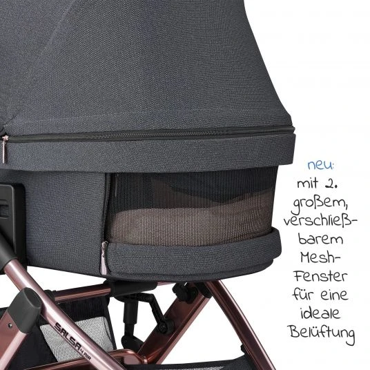 Stilvoll. Edel. Exklusiv. Eine neue Definition von Ästhetik. Hochwertige Materialien, ausdrucksstarke Formgebung und elegante Designs treffen eindrucksvoll auf Zeitgeist. Die Diamond Edition steht für pure Eleganz und einen hohen Designanspruch bis ins Detail. Das Design Bubble begeistert dabei vor allem mit einem Zartrosa im Inneren als harmonische, sanfte und elegante Ergänzung zum modernen Grau. Das farblich dazu passende Gestell rundet das glanzvolle Gefährt gekonnt ab.