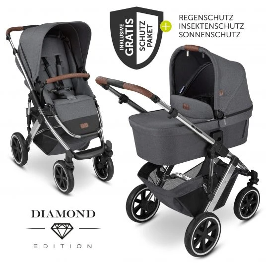 - NEU – DIAMOND EDITION: Jetzt mit noch besser belüfteter Babywanne mit zweitem Belüftungsfenster & extra weicher Babywannen-Matratze mit Schutzrand – kombiniert mit exklusiven Stoffen und edler Lederoptik an Schiebegriff und Schutzbügel.