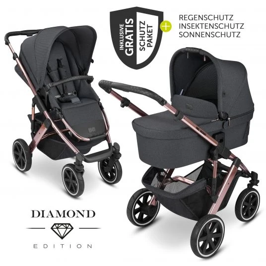 - NEU – DIAMOND EDITION: Jetzt mit noch besser belüfteter Babywanne mit zweitem Belüftungsfenster & extra weicher Babywannen-Matratze mit Schutzrand – kombiniert mit exklusiven Stoffen und edler Lederoptik an Schiebegriff und Schutzbügel.