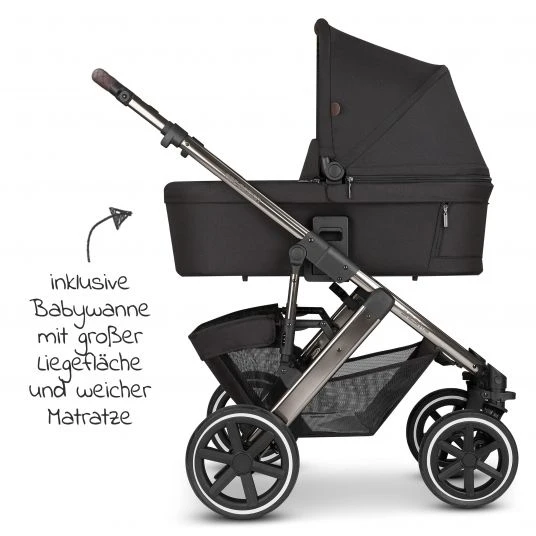 - NEU – DIAMOND EDITION: Jetzt mit noch besser belüfteter Babywanne mit zweitem Belüftungsfenster & extra weicher Babywannen-Matratze mit Schutzrand – kombiniert mit exklusiven Stoffen und edler Lederoptik an Schiebegriff und Schutzbügel.