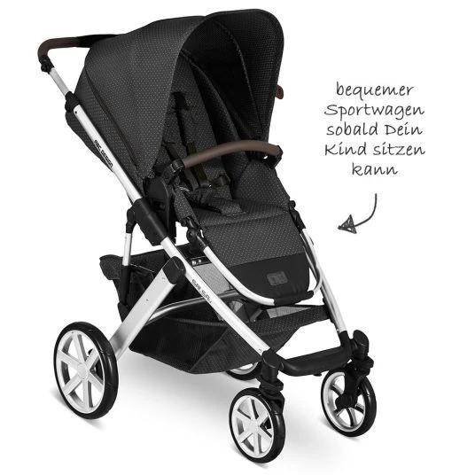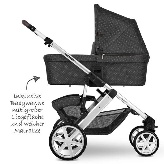- Ausstattung: Babywanne mit Matratze und großem Sonnenverdeck, Sportwagensitz mit flacher Liegeposition, ausklappbarem Verdeck, gepolstertem 5-Punkt-Gurt, abnehmbarem Schutzbügel, kugelgelagerte und pannensichere Luftkammerräder, zentrale Federung, höhenverstellbarer Schieber