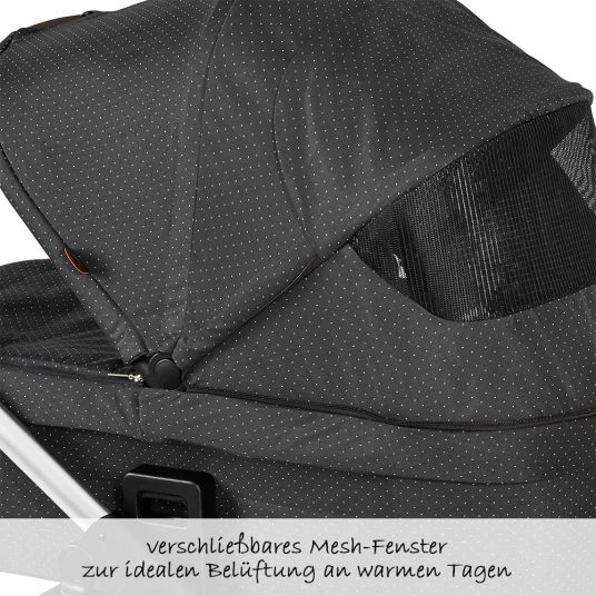 An den niedlichen Fuchs-Motiven erfreuen sich die Kleinen genauso wie die Großen. Der Außenstoff mit feinem Punkt-Muster greift den verspielten Look auf, wirkt aber in Verbindung mit den bewusst dezent gehaltenen Farben, dem silberfarbenen Gestell, den Lederapplikationen an Schieber und Schutzbügel und den Weißwandreifen gleichzeitig elegant.