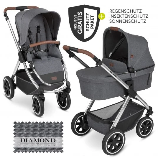 Der Kombi-Kinderwagen Samba – inkl. Babywanne und Sportsitz – Diamond Edition in Asphalt von ABC Design ist ein sehr gut ausgestatteter Allrounder auf 4 Rädern. Er ist superleicht und bietet durch seine All-Terrain Bereifung mit Luftkammerrädern ein sehr breites Einsatzspektrum. Dank des extrem kleinen Faltmaßes bekommst Du ihn auch in einen kleinen Kofferraum. Im Vergleich zu den anderen Modellen von ABC Design musst Du hierzu nicht mal den Sportwagen-Aufsatz abnehmen. Trotzdem bietet er den gleichen Komfort wie die anderen Modelle.