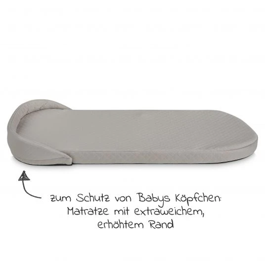 Die Babywanne ist mit einer hochwertigen, besonders weichen, ergonomischen Overnight-Matratze mit erhöhtem Rand im Kopfbereich ausgestattet und bettet Dein Neugeborenes sehr bequem. Neu: Das Extra-Plus an Komfort bietet nun die Rückenlehne, diese ist im hinteren Bereich nach oben verstellbar. Geschützt wird es von der passenden Wannenabdeckung und einem großen Verdeck. Das Verdeck ist mit einem UV-Schutz 50+ ausgestattet. Für warme Tage ist jeweils ein Belüftungsfenster am Verdeck und eines am Kopfende der Wanne integriert.