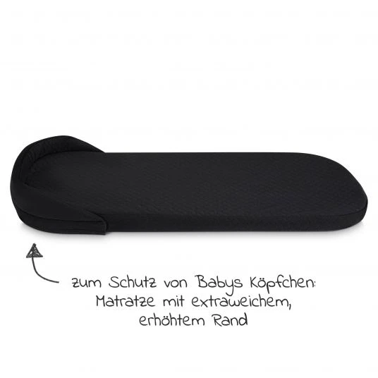 Die extra große Babywanne ist mit einer ergonomischen Overnight-Matratze ausgestattet und bettet Dein Neugeborenes weich und bequem. Luftlöcher im Schaumstoff der Matratze garantieren eine angenehme Belüftung. Am Kopfende schützt die Keilform das kleine Köpfchen und lagert es hoch. Geschützt wird es in der Wanne von der passenden Abdeckung und einem großen Verdeck.