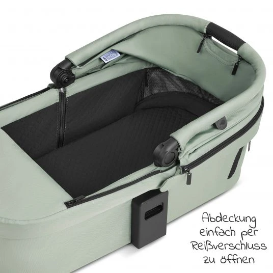 Das Verdeck ist mit einem UV-Schutz 50+ ausgestattet. Für warme Tage sind zwei individuell nutzbare Belüftungsfenster integriert, um einen Hitzestau zu vermeiden und den Blick auf Dein Baby freizugeben. Falls Dir der Wagen beim nächsten Restaurantbesuch zu sperrig ist, nimmst Du die Wanne einfach ab und trägst sie per Hand am stabilen Tragegriff. Wenn Du für den Transport im Auto wenig Platz hast, kannst Du die Wanne einfach zusammenfalten.