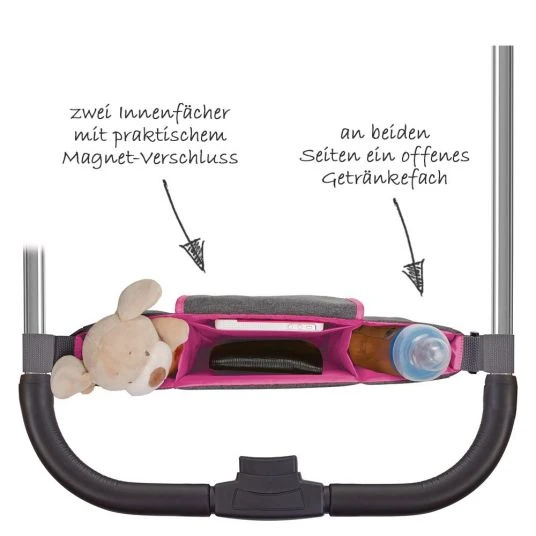 Mittels zweier stabiler Klettverschlüsse kann der Organizer am Schieber oder an den Buggygriffen aller herkömmlichen Kinderwagen befestigt werden – so ist er universell einsetzbar. Aus hochwertigem Twill-Gewebe gefertigt, punktet der praktische Organizer außerdem mit seinem sportlichen Design und der farbigen Umrandung am Verschluss.
