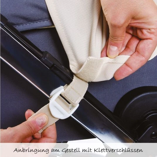 Dank mitgeliefertem Befestigungsmaterial kann das Schlummertuch variabel angebracht werden. Mit den drei Clips befestigen Sie es am Kinderwagendach und mit den zwei Klettbänder am Wagengestell. Alle Befestigungsteile sind auf einer Seite mit einem Klettband versehen, wobei sich das Gegenstück dazu am Tuch befindet. Die Halterung verbleibt am Kinderwagen und das Tuch kann mitgenommen werden. Das atmungsaktive Material verhindert einen Wärmestau unter dem Tuch.