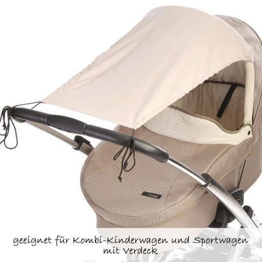 Das Sonnensegel kann ganz einfach entlang der Kordeln zurückgeschoben werden und ermöglicht so leicht den Sichtkontakt zu Ihrem Kind. Je nach Sonneneinstrahlung können Sie das Segel auch nach links oder rechts verschieben, wodurch immer ein optimaler Sonnenschutz gewährleistet wird. Der helle Beigeton ist neutral und passt somit zu jedem Kinderwagen.
