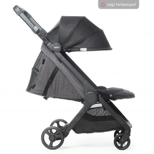 Der Metro+ hat einen durchgehenden Schiebegriff und ermöglicht so auch einhändiges Manövrieren. Mit schmalen, leichtgängigen und pannenfreie Räder aus PU (Polyurethan). Die schwenkbaren Vorderräder kommen um jede Kurve. Die Federung gleicht kleine Unebenheiten spielend leicht aus. So wird jede Bordsteinkante zum Kinderspiel. Die leicht zu bedienende One-Touch Fußbremse stoppt den Wagen sicher.