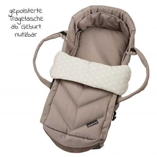 Aufgrund der hohen Seitenteile, dem stabilen Alurahmen sowie einem Sicherheitsstecker zwischen Sitz und Tasche, ist Dein Baby rundum optimal geschützt. Ist es aus der Tragetasche einmal herausgewachsen, kannst Du sie ganz einfach mit wenigen Handgriffen zu einem kuscheligen Fußsack umfunktionieren. Außerdem eignet sich die enthaltene Auflage später als weiche Sitzauflage für den Buggy-Sportsitz. Travelsystem: Die passenden Adapter für die Gesslein Babyschale oder andere Schalen wie z.B. von Maxi Cosi sind separat erhältlich.