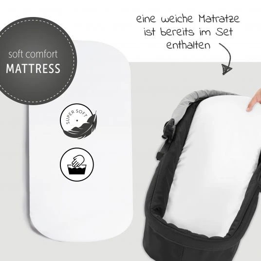- Ausstattung Babyschale: 3-Punkt-Gurt, Seitenschutz, Memory-Foam, Easy-Fix-System, One-Hand-Release, Verdeck, abnehmbarer Bezug