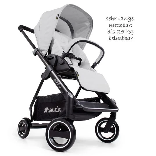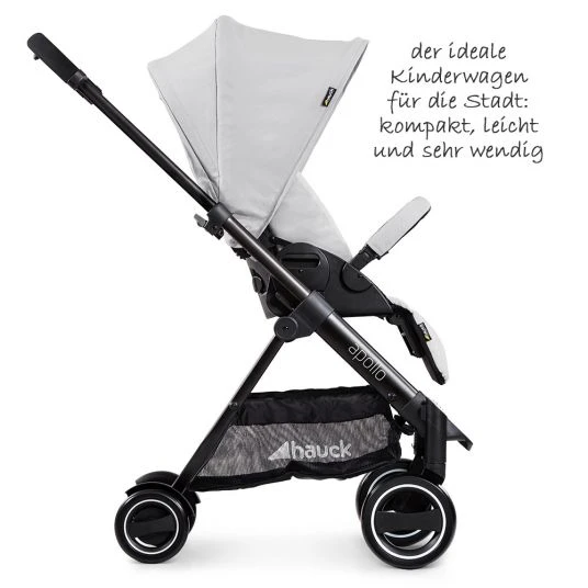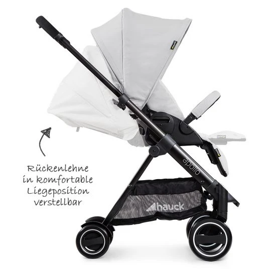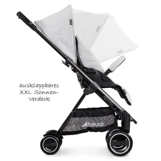 Der Sportwagen Apollo von Hauck ist perfekt auf das schnelle Stadtleben abgestimmt. Die bequeme Sitzeinheit stellst Du mit nur einer Hand schnell von aufrechter Sitz- in eine flache Liegeposition. So kann Dein Kleines ein verdientes Nickerchen halten. Das große, ausziehbare Verdeck schützt dabei vor Sonne, Wind und Lärm. Die mitgelieferte Beindecke sorgt für Wärme an kalten Tagen. Der Sitz ist weich gepolstert und trägt Kinder bis 25 kg. So begleitet der Buggy euch über einen extra langen Zeitraum. Super: Die leichte Sitzeinheit kann einfach abgenommen und umgesetzt werden. Anfangs blickt Dein Kleines so zu Mama und Papa. Später gucken neugierige Entdecker nach vorne, den Weg bestens im Blick. Ein gepolsterter 5-Punkt-Gurt hält Deinen Schatz fest im Sitz. Zusätzliche Sicherheit bietet der Schutzbügel. Um Dir das Reinsetzen zu erleichtern, ist er einfach abnehmbar. Auch der große Korb hilft Dir im Alltag: Einkäufe und Baby-Sachen kannst Du hier bequem ablegen.