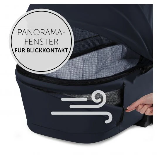 Das Premium-Design wird durch hochwertige, pflegeleichte Textilien sowie zwei XXL Panoramafenster ergänzt, die du individuell öffnen kannst. So ist für optimale Luftzirkulation gesorgt und dein Baby genießt den Blick in Rücken- und Bauchlage. Das 3 Zonen Verdeck mit extra Sonnenblende und UV-Schutz 50+ sowie ein farblich passender Windschutz runden das durchdachte Design ab.