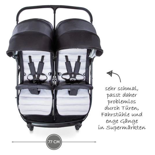 Die weich gepolsterten Sitze machen es Deinen Kindern besonders bequem. Rückenlehne und Fußstütze kannst Du bis in eine flache Liegeposition verstellen. Praktisch: Die Sitzeinheiten können getrennt voneinander beliebig verstellt werden. So kann ein Kind schlafen und eines aufrecht die Umgebung beobachten. Geschützt werden die Kids von großen, ausziehbaren Verdecken, die Wind & Wetter fernhalten. An warmen Tagen sorgt der Netzeinsatz für eine angenehme Belüftung. 5-Punkt-Gurt und gepolsterte Schutzbügel halten Ihre Kinder sicher im Sitz.