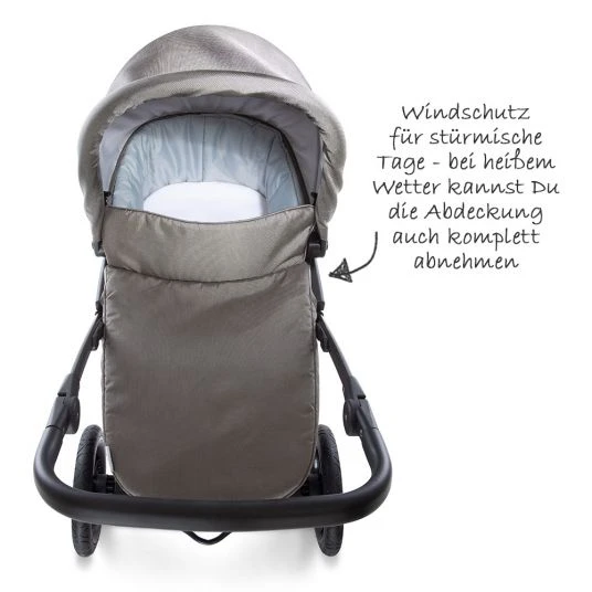 In der Babywanne liegt schon Dein Neugeborenes super bequem. Sie ist mit einer Matratze und einem Verdeck ausgestattet und so der perfekte Platz für kleine Schlafmütze. Sobald Dein Kind selbstständig sitzen kann, tauscht Du sie gegen den Sportwagenaufsatz aus – dieser trägt Kinder bis zu einem Gewicht von 25 kg. Das geht superleicht und ohne zusätzlichen Adapter. Der Sitz ist weich auch weich gepolstert und kann dank verstellbarer Rückenlehne und Fußstütze bis in die Liegeposition gebracht werden. So darf Dein Schatz auch hier in aller Ruhe schlafen. Gehalten wird er dabei von einem 5-Punkt-Gurt und einem Schutzbügel. Um blendende Sonnenstrahlen und kühlen Wind kümmert sich das große Verdeck.