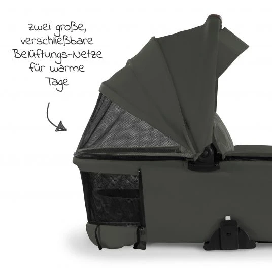 Die Babywanne ist mit einer hochwertigen Matratze ausgestattet und bettet Dein Neugeborenes weich und bequem. Geschützt wird es von der passenden Wannenabdeckung und einem großen Verdeck. Unter der Matratze ist der Boden mit Ventilationsöffnungen versehen, damit sich keine Feuchtigkeit sammeln kann. Das Verdeck ist mit einem UV-Schutz 50+ ausgestattet. Dein Baby hat dank der zwei XXL-Panoramafenster frische Luft sowie freie Sicht in Rücken- und Bauchlage. Falls Dir der Wagen beim nächsten Restaurantbesuch zu sperrig ist, nimmst Du die Wanne einfach ab und trägst sie per Hand am stabilen Tragegriff. Wenn Du für den Transport im Auto wenig Platz hast, kannst Du die Wanne einfach zusammenfalten.