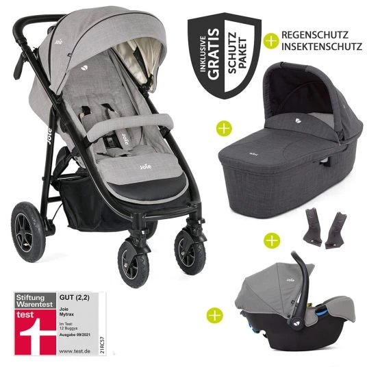 Mit dem Kombi-Set von Joie, bestehend aus Buggy & Sportwagen Mytrax Gray Flannel, Babywanne Ramble Pavement mit Adapter und Babyschale i-Snug Gray Flannel inklusive Basis bist Du komplett ausgerüstet und kannst ab der Geburt Deines Kindes gut gesichert und komfortabel durchstarten. Der robuste Allrounder Mytrax überzeugt mit klassischen Ausstattungsmerkmalen, wie einer verstellbaren Rückenlehne, einem großen Verdeck und mitwachsendem 5-Punkt-Gurt mit SoftTouch-Polsterung. Außerdem bietet er Dir weitere Features: Mit den luftgefüllten Hinterreifen bist Du auf jedem Untergrund laufruhig unterwegs. Die Felgen sind mit Reflektoren ausgestattet und sorgen für mehr Sicherheit in der Dunkelheit. Zusätzlich ist der Mytrax mit einem höhenverstellbaren Schieber und coolen Applikationen in Lederoptik ausgestattet.