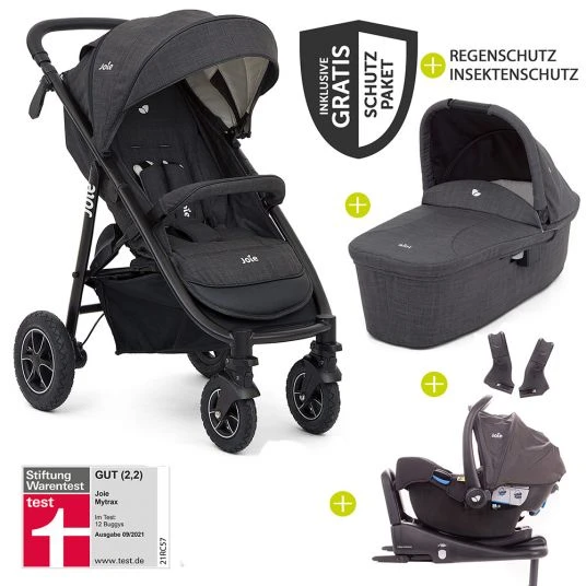 Mit dem Kombi-Set von Joie, bestehend aus Buggy & Sportwagen Mytrax, Babywanne Ramble mit Adapter und Babyschale i-Snug inklusive Basis bist Du komplett ausgerüstet und kannst ab der Geburt Deines Kindes gut gesichert und komfortabel durchstarten. Der robuste Allrounder Mytrax überzeugt mit klassischen Ausstattungsmerkmalen, wie einer verstellbaren Rückenlehne, einem großen Verdeck und mitwachsendem 5-Punkt-Gurt mit SoftTouch-Polsterung. Außerdem bietet er Dir weitere Features: Mit den luftgefüllten Hinterreifen bist Du auf jedem Untergrund laufruhig unterwegs. Die Felgen sind mit Reflektoren ausgestattet und sorgen für mehr Sicherheit in der Dunkelheit. Zusätzlich ist der Mytrax mit einem höhenverstellbaren Schieber und coolen Applikationen in Lederoptik ausgestattet.