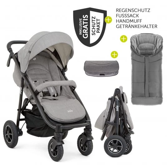 Der Joie Mytrax Flex mit Komfort-Federung, Getränkehalter, Regenschutz, Fußsack & Handmuff bis 22 kg – Gray Flannel ist der perfekte Stadt- und Reisebegleiter. Dank der pannensicheren, schaumstoffgefüllten Reifen können Scherben und spitze Steine dem Mytrax Buggy nichts anhaben. Der praktische Einhand-Faltmechanismus ermöglicht es Dir, den Sportsitz samt Gestell sehr einfach zusammenzuklappen. Der Buggy wird inklusive Regenschutz und Getränkehalter geliefert, so habt ihr erstmal all das, was ihr für eure täglichen Ausflüge benötigt, parat.