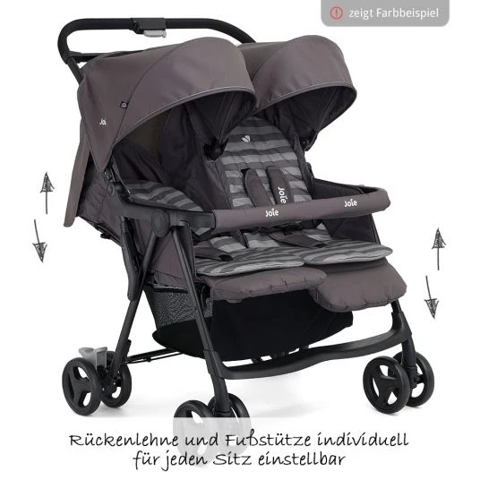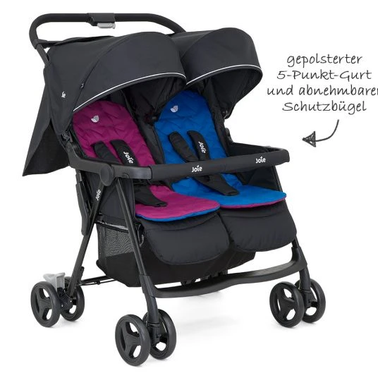 Bietet Zwillingen und Geschwistern mit geringem Altersabstand jede Menge Komfort: Der Geschwister- & Zwillingsbuggy AireTwin – Rosy & Sea inkl. Regenschutz von Joie ist ein richtiges Multitalent. Mit seinen schwenkbaren Doppelrädern, der Federung und den getrennt voneinander verstellbaren Rückenlehnen sorgt er bei kleinen Leuten für großes Fahrvergnügen.