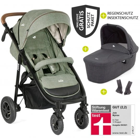 Mit dem Kombi-Kinderwagen von Joie, bestehend aus Buggy & Sportwagen Mytrax Laurel, Babywanne Ramble bist Du komplett ausgerüstet und kannst ab der Geburt Deines Kindes gut gesichert und komfortabel durchstarten. Der robuste Allrounder Mytrax überzeugt mit klassischen Ausstattungsmerkmalen, wie einer verstellbaren Rückenlehne, einem großen Verdeck und mitwachsendem 5-Punkt-Gurt mit SoftTouch-Polsterung. Außerdem bietet er Dir weitere Features: Mit den luftgefüllten Hinterreifen bist Du auf jedem Untergrund laufruhig unterwegs. Die Felgen sind mit Reflektoren ausgestattet und sorgen für mehr Sicherheit in der Dunkelheit. Zusätzlich ist der Mytrax mit einem höhenverstellbaren Schieber und coolen Applikationen in Lederoptik ausgestattet.