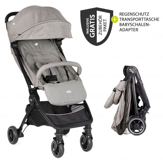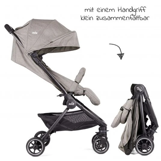 Der Reisebuggy Pact – Gray Flannel von Joie eignet sich ideal für aktive Familien. Wenn Du viel unterwegs bist, wirst Du den Pact lieben. Durch seine sehr kompakte und leichte Bauweise wird er nie zur Belastung. Egal ob Du mit dem Auto, Flugzeug, Bus oder Bahn unterwegs bist, für den Buggy findest Du immer einen Platz. Dabei bleibt der Komfort nicht auf der Strecke. Der Pact steht wesentlich schwereren Modellen in nichts nach. Neben einer komfortablen Liegeposition bietet er ein großes Verdeck mit UV-Schutz. Die vier pannensicheren Weißwand-Reifen sehen nicht nur gut aus, sondern sind dank Einzelrad-Federung auch sehr komfortabel. Im Handumdrehen kannst Du den Reisebuggy mit einer Hand falten und mit dem praktischen Gurt super bequem tragen.