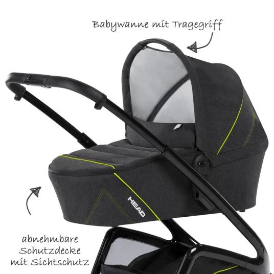 Auch Du bist mit dem Head äußerst komfortabel unterwegs: Der durchgehende Schieber mit ist angenehm im Griff und lässt sich in der Höhe verstellen. So kannst Du die Schiebehöhe ganz individuell an Deine KörperGröße anpassen. Ebenfalls höhenverstellbar sind die Babywanne bzw. der Sportsitz. Beide kannst Du am Gestell nach oben bzw. unten verschieben – so kannst Du den Wagen problemlos an Deine persönlichen Bedürfnisse anpassen. Babys Windeln, Pflegeutensilien, Snacks und Fläschchen finden Platz im verschließ- und abnehmbaren Einkaufskorb. Bei Regen bewähren sich die hochwertigen, wasserabweisenden Scotchgard-Bezüge.