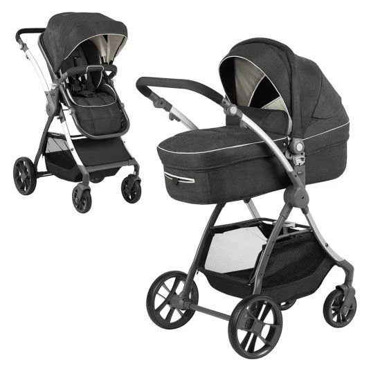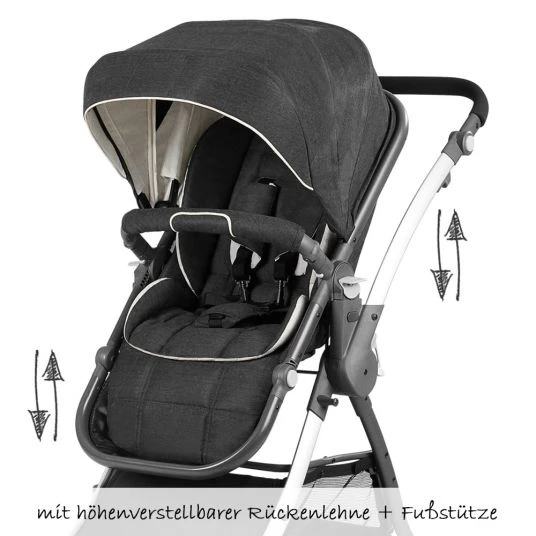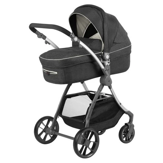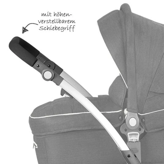 - Ausstattung: schwenk- und feststellbare Vorderräder, geschwungenes Aluminium-Gestell, tragbare Babywanne mit Schutzdecke , Sportwagenaufsatz mit mehrfach verstellbarer Rückenlehne, gepolsterter Fußstütze, großem Verdeck, XXL-Einkaufskorb, abnehmbarer Schutzbügel, Knickschieber, beidseitig aufsetzbarer Sportsitz, Höhenverstellung bei Babywanne und Sportsitz möglich, Easy-Fold-Mechanismus