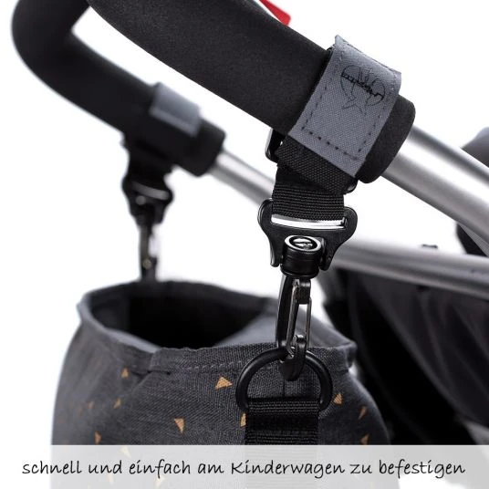 Im Organizer Buggy Bag Triangel in Dark Grey von Lässig hast Du Platz für wichtige Utensilien, die Du unterwegs benötigst. Die kleine Tasche hält mit ihrer übersichtlichen Innenaufteilung Tücher, Kekse, Handy und vieles mehr zusammen, damit Du immer alles griffbereit hast. Das große Hauptfach lässt sich sicher mit einem Reißverschluss verschließen. In zwei weiteren Fächern seitlich kannst Du Fläschchen und Gläschen gut verstauen. Der Organizer wird ganz einfach mittels Karabinern an den Schiebegriffen Deines Buggy befestigt. Der kompakte Kinderwagen-Organizer ist auch im Alltag und auf Reisen sehr nützlich.