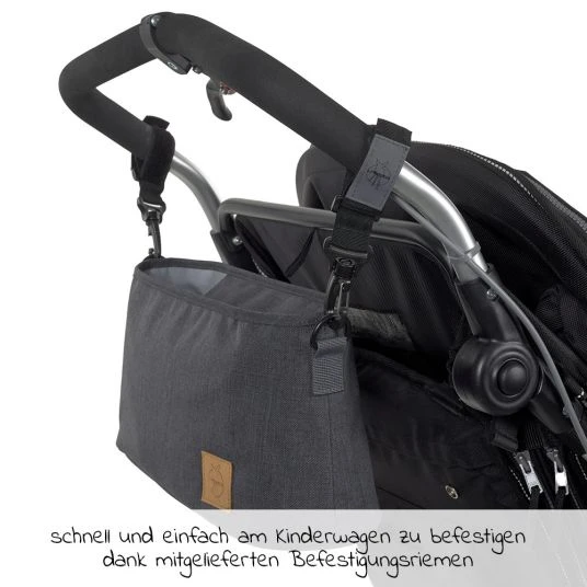 Das große Hauptfach lässt sich sicher mit einem Reißverschluss verschließen. In zwei weiteren Fächern seitlich kannst Du Fläschchen und Gläschen gut verstauen. Der Buggy Organizer wird ganz einfach mittels Karabinern an den Schiebegriffen Deines Kinderwagens oder Buggys befestigt. Der kompakte Kinderwagen Organizer ist auch im Alltag und auf Reisen sehr nützlich.