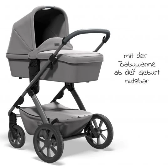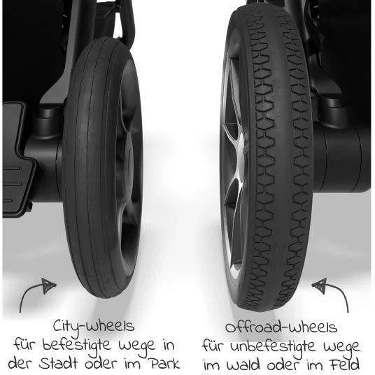 Der 2in1 Kombi-Kinderwagen No One 2.0 Stone von Moon vereint kleines Gewicht und Faltmaß mit idealem Fahrkomfort und praktischen Funktionen. Ein Kinderwagen mit allem, was ein moderner Wagen braucht – zu einem unschlagbaren Preis. Durch seine 2 Radsätze ist er für wirklich jedes Gelände geeignet. Das Offroad Whells-Set mit seinen großen Gummirädern hinten 29 cm / vorne 20 cm ist ideal fürs Gelände und unbefestigte Wege. Das City Wheels-Set mit seinen EVA-Rädern hinten 25 cm / vorne 18 cm ist ideal für befestigte Wege in der Stadt oder im Park.