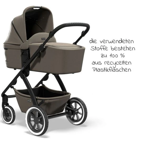 Der 2in1 Kombi-Kinderwagen Relaxx Spezial Edition Mud Recycled von Moon bietet alle Vorteile des Relaxx und die verwendeten Stoffe besteht zu 100 % aus recycelten Plastikflaschen – ohne Einschränkung an Funktion und Komfort. So trägst Du dazu bei, dass unsere Umwelt sauberer wird und die Ressourcen geschont werden. Der Relaxx ist ein Wagen für entspanntes Großwerden. Die offene Rahmenkonstruktion und die großzügige konzipierte Babywanne machen den Relaxx zum Ersatzbett. Der Innovative Klappmechanismus sorgt dafür, dass der Relaxx mit Sportsitz ein kleines Faltmaß besitzt und sich für den Transport optimal eignet. Exklusiv in der EditionVersion erhältst Du das Komfort-Paket mit Lufträder, einer PREMIUM Matratze der Marke Träumeland, das patentierte CIRC AIR-System sowie ein extra Panoramafenster in der Babywanne. Das CIRC AIR-System von Moon sorgt in Verbindung mit der atmungsaktiven Premium-Matratze von Träumeland für eine ideale Klimatisierung und Sauerstoffzufuhr in der Babywanne.