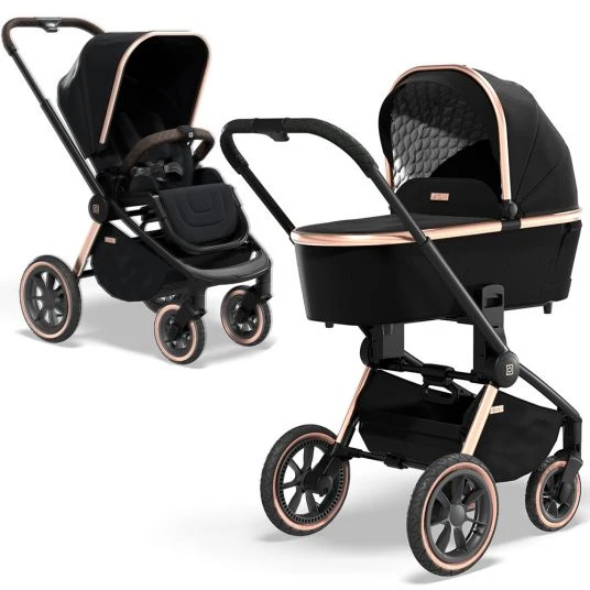 - Besonderheiten: Allradfederung, Bezüge von Schieber und Schutzbügel aus veganem Lederimitat, extra lange Rückenlehne für größere Kinder, lässt sich klein zusammenfalten, Sitz auf Tischhöhe, Babywanne mit CIRC Air-System und Panoramafenster, Träumeland Premium-Matratze