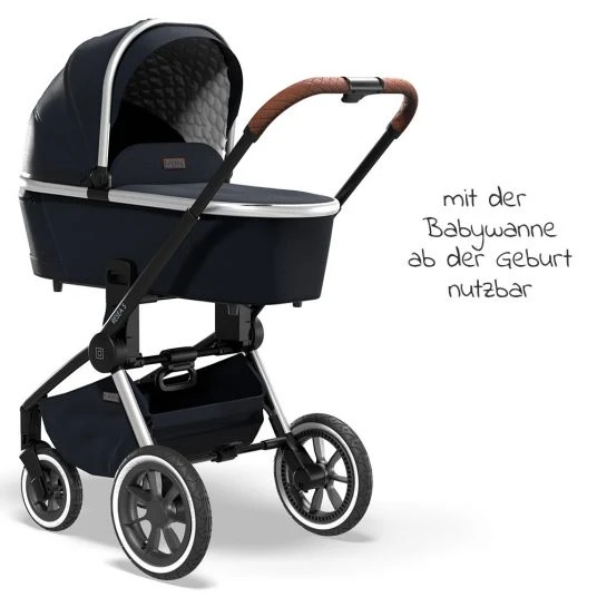- Besonderheiten: Allradfederung, Bezüge von Schieber und Schutzbügel aus veganem Lederimitat, extra lange Rückenlehne für größere Kinder, lässt sich klein zusammenfalten, Sitz auf Tischhöhe, Babywanne mit CIRC Air-System und Panoramafenster, Träumeland Premium-Matratze