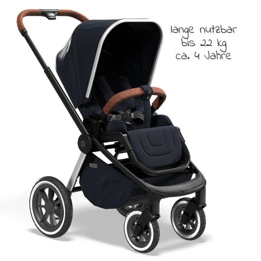 - Ausstattung: umsetzbare Sitzeinheit, weich gepolsterte Rückenlehne bis in Liegeposition verstellbar, gepolsterter mitwachsender 5-Punkt-Gurt, extra großes Verdeck mit Klimafenster, UV-Schutz 50+, höhenverstellbarer Schieber, große Hinterräder (29 cm), schwenkbare und feststellbare Vorderräder (19,5 cm), Feststellbremse, abnehmbarer und aufklappbarer Schutzbügel, großer Einkaufskorb