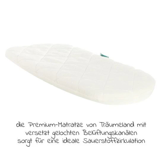 Die von Moon entwickelte Wannenboden-Technologie CIRC-Air-System – Belüftungskanäle im Wannenboden – und die atmungsaktive Matratze von Träumeland sorgen im Inneren der Wanne für eine gesunde Sauerstoffzirkulation. Dadurch sinkt das Risiko einer Überhitzung oder Unterkühlung. Zusätzlich wird das Schlafklima durch den Feuchtigkeitsausgleich der Matratze verbessert. Der punktelastische Kaltschaum-Kern der Matratze hat einen gesunden Härtegrad für Kopf und Wirbelsäule Deines Babys und sorgt so für eine gesunde Liegeposition.