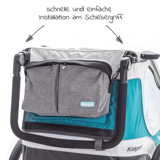 Unterwegs gibt es viele Kleinigkeiten die man bei einem Ausflug mit dem Fahrradanhänger im Buggy-Modus dabei haben möchte. Wenn die Stauräume am Anhänger schon ausgereizt sind, ist die Queridoo Tasche Organizer für den Schiebergriff in Grau die optimale Lösung. Mit ihr findest Du alles Wichtige direkt vor Dir am Schiebegriff übersichtlich verstaut. Die Tasche bietet genug Platz für Trinkflasche, Tücher, Kekse, Handy und vieles mehr. Besonders praktisch: Du kannst sie auch dank breitem Schultergurt als Umhängetasche nutzen.
