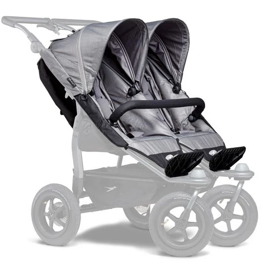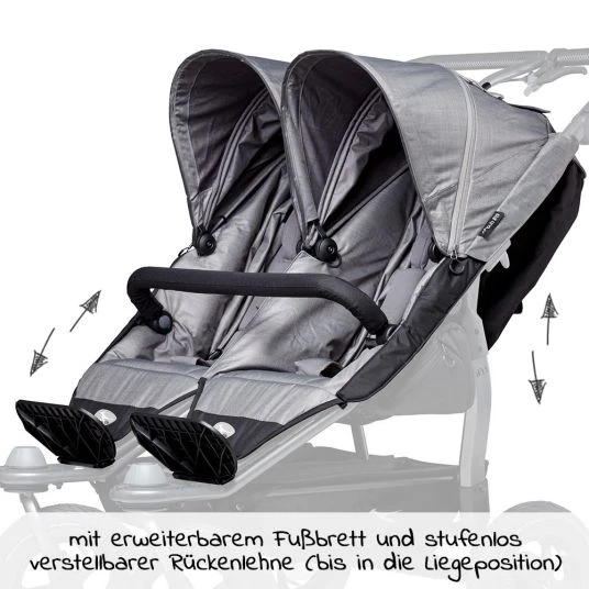 Die XXL-Komfortsitze für den Geschwister- und Zwillingswagen Duo – Grau ermöglichen die Nutzung Deines Kinderwagens Duo über das Kleinkindalter hinaus. Auch Kinder im Kindergartenalter werden bei Wanderungen und längeren Aufenthalten im Freien irgendwann müde. Im Sportsitz können sie sich zwischendurch ausruhen – oder auch einfach mal die Augen zumachen. Die Sitzflächne der Sportsitze sind stufenlos bis in die Liegeposition verstellbar um sie optimal den Bedürfnissen Deiner Kinder anpassen zu können. Hier findet Dein Nachwuchs im Alter von mind. 9 Monaten bis ca. 4 Jahre (Gesamtbelastung von 45 kg) bequem Platz. Zusätzlich sind die Sitze mit erweiterbaren Fußbrettern ausgestattet. So können Deine Kleider in jedem Alter bequem die Füße hochlegen. Sicherheit muss dabei sein: Deshalb ist jede Sitzeinheit nicht nur mit einem Kopfpolster sondern auch mit einem gut gepolstertem 5-Punkt-Gurtsystem ausgestattet. Die beiden Sitzeinheiten teilen sich einen großen, gepolsterten Schutzbügel, der sich für den leichten Ein- und Ausstieg öffnen lässt. Für Schatten im Inneren sorgen zwei große, ausziehbare Verdecke. Wird es Draußen einmal ungemüglich, kommen in die beiden in die Rückseite der Sitze integrierten Regenverdecke zum Einsatz.
