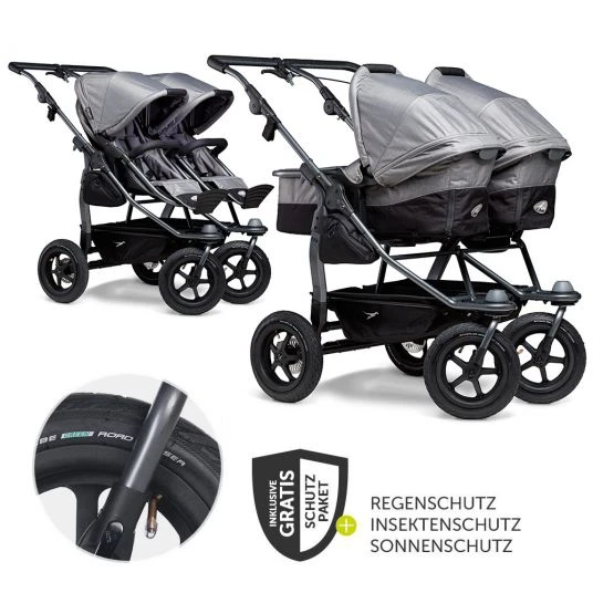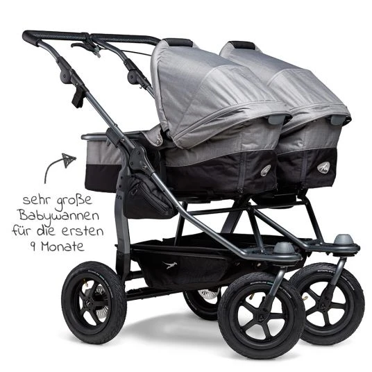 Der Geschwister- und Zwillings-Kombi-Kinderwagen Duo – Grau mit 2 Babywannen, die zu Sportsitzen umbaubar sind, ist die konsequente Weiterentwicklung der bewährten TFK-Klassiker Twin Trail und Twin Adventure. Wie bei seinen Vorgängern werden auch hier Qualität und Sicherheit großgeschrieben.
