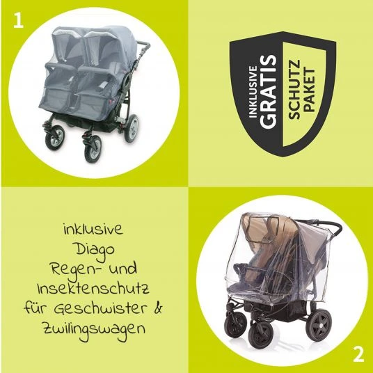 Mit gratis XXL-Zubehörpaket, das einen Regenschutz und ein Insektenschutznetz für die Sportsitze von Diago enthält.