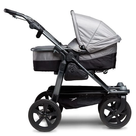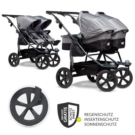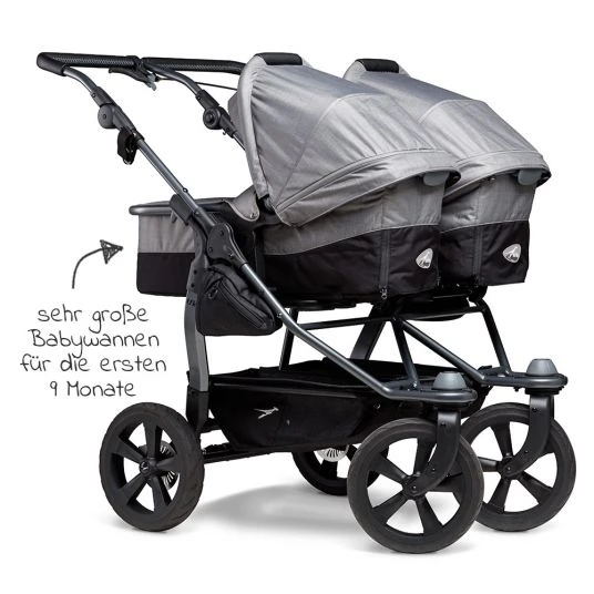 Der Geschwister- und Zwillings-Kombi-Kinderwagen Duo – Grau mit 2 Babywannen, die zu Sportsitzen umbaubar sind, ist die konsequente Weiterentwicklung der bewährten TFK-Klassiker Twin Trail und Twin Adventure. Wie bei seinen Vorgängern werden auch hier Qualität und Sicherheit großgeschrieben.